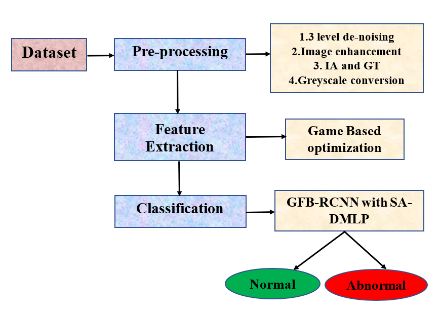 To overcome the limitations of the current approaches, a method called the multi-level fuzzy aware denoising technique with a gradient-enhanced convolution network and a level classifier is proposed for detecting and classifying psoriasis disease. Initially, pre-processing is done by using techniques like 3-level de-noising, Image enhancement (CLAHE using Game-based optimization algorithm), Image Augmentation and Geometric transformations, and Greyscale conversion. The next step is feature extortion, in which the required features are extracted using GBO. The final step is the classification by which the result will be obtained like whether the given input is normal or abnormal using the approach called Gradient Feature Boosted Region Convolutional Neural Network (GFB-RCNN) with a Self-attention based dual Multi-Layer Perception (MLP) (SA-DMLP). Fig 1 shows the Block illustration of the recommended approach.