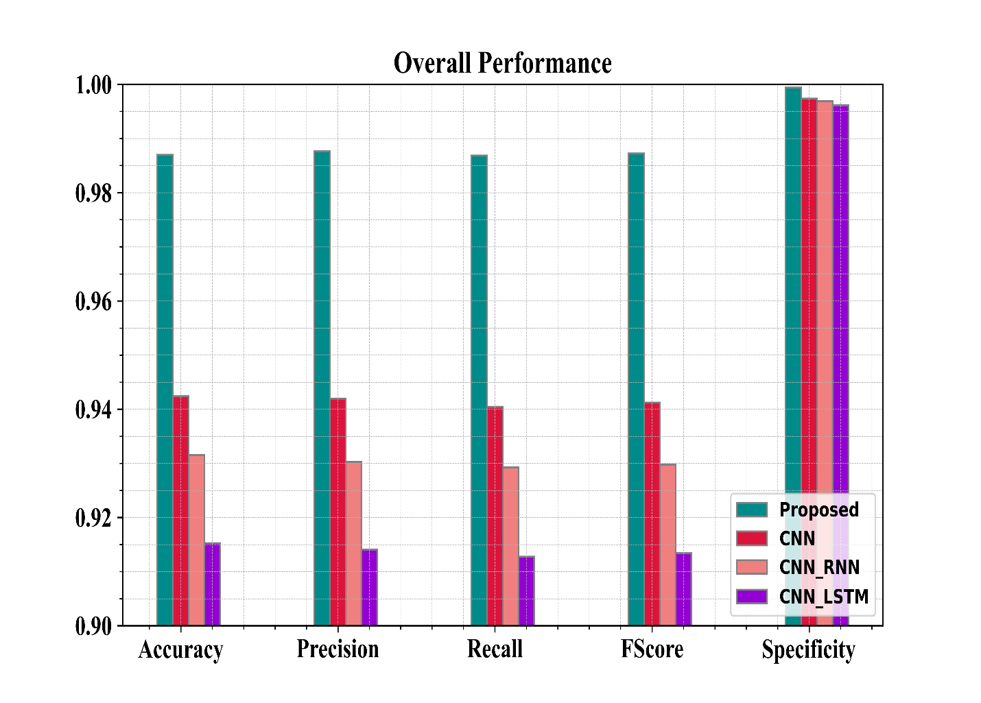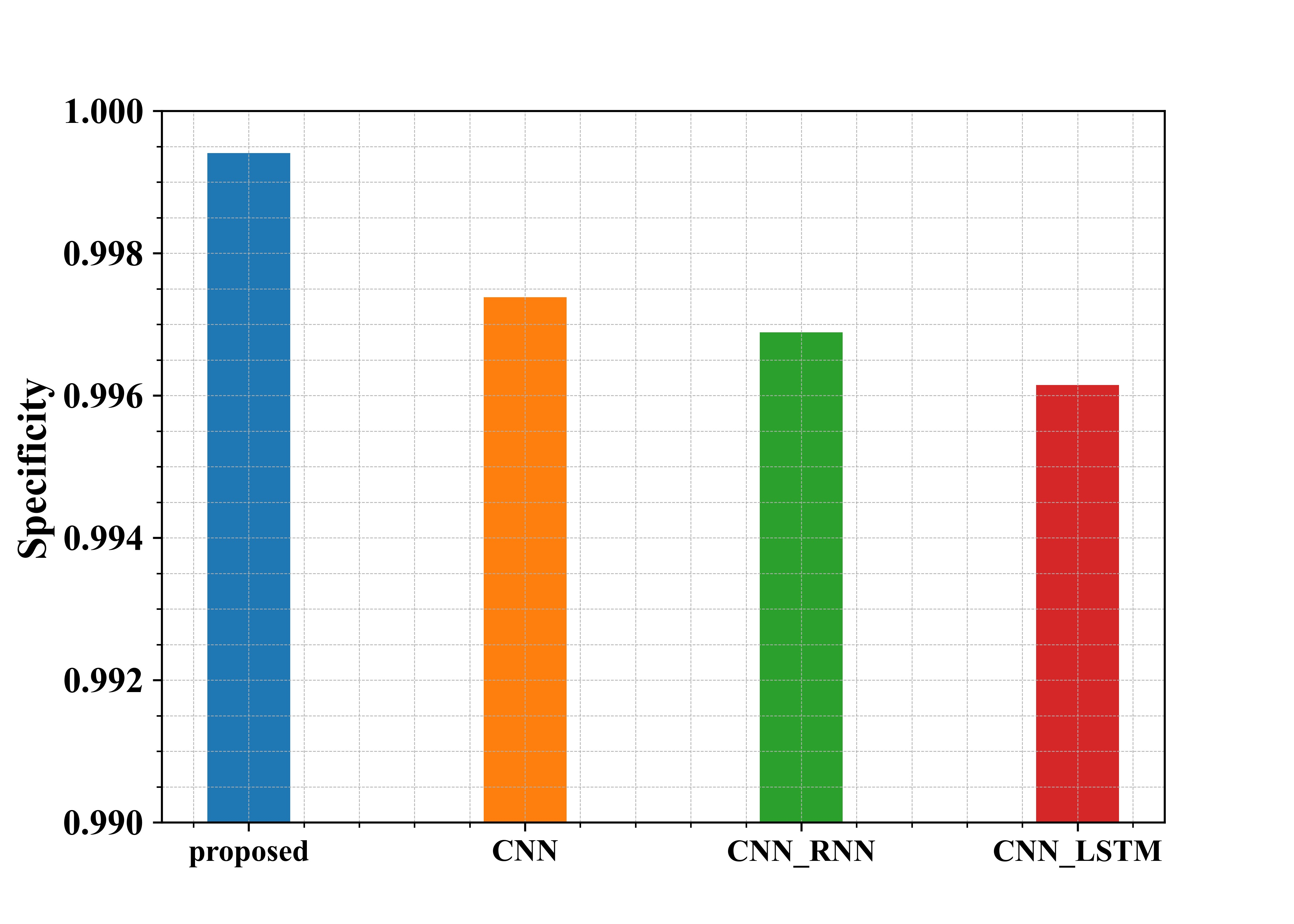 Figure 5 shows the examination of the recommended methods in use in regard to Specificity. From the graph, the proposed approach has a Specificity of about 99.9%, whereas the existing methods CNN, CNN-RNN and CNN-LSTM have a Specificity of 99.7%, 99.6%, and 99.6%, respectively. Thus, from the graphical representation, it is seen that the proposed approach has a higher Specificity.