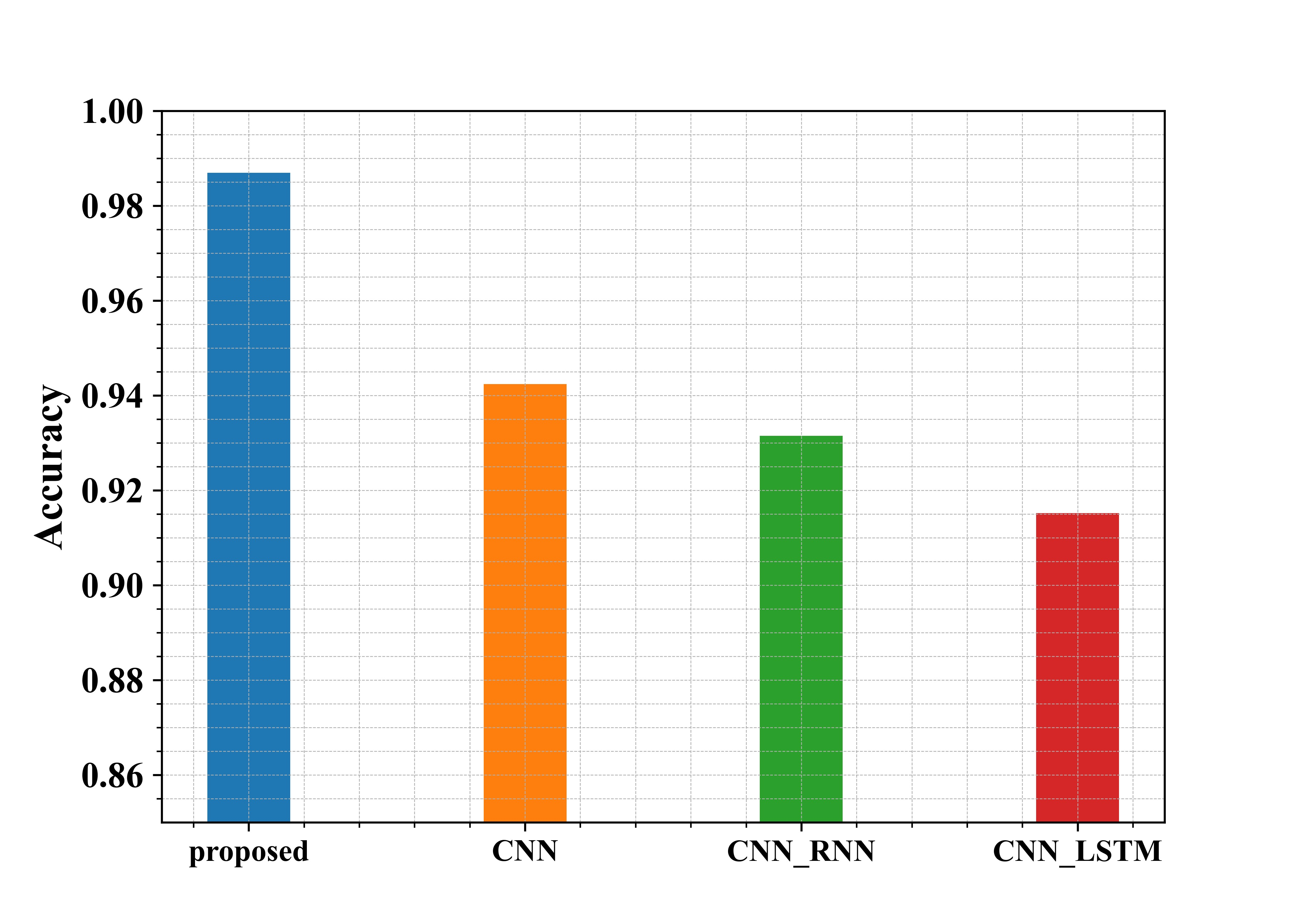 Figure 3 shows the examination of the recommended methods in use in regard to Accuracy. From the graph, the proposed approach has an accuracy of about 98.7%, whereas the existing methods CNN, CNN-RNN and CNN-LSTM have an accuracy of 94.2%, 93%, and 91.5%, respectively. Thus, from the graphical representation, it is seen that the proposed approach is more Accurate.