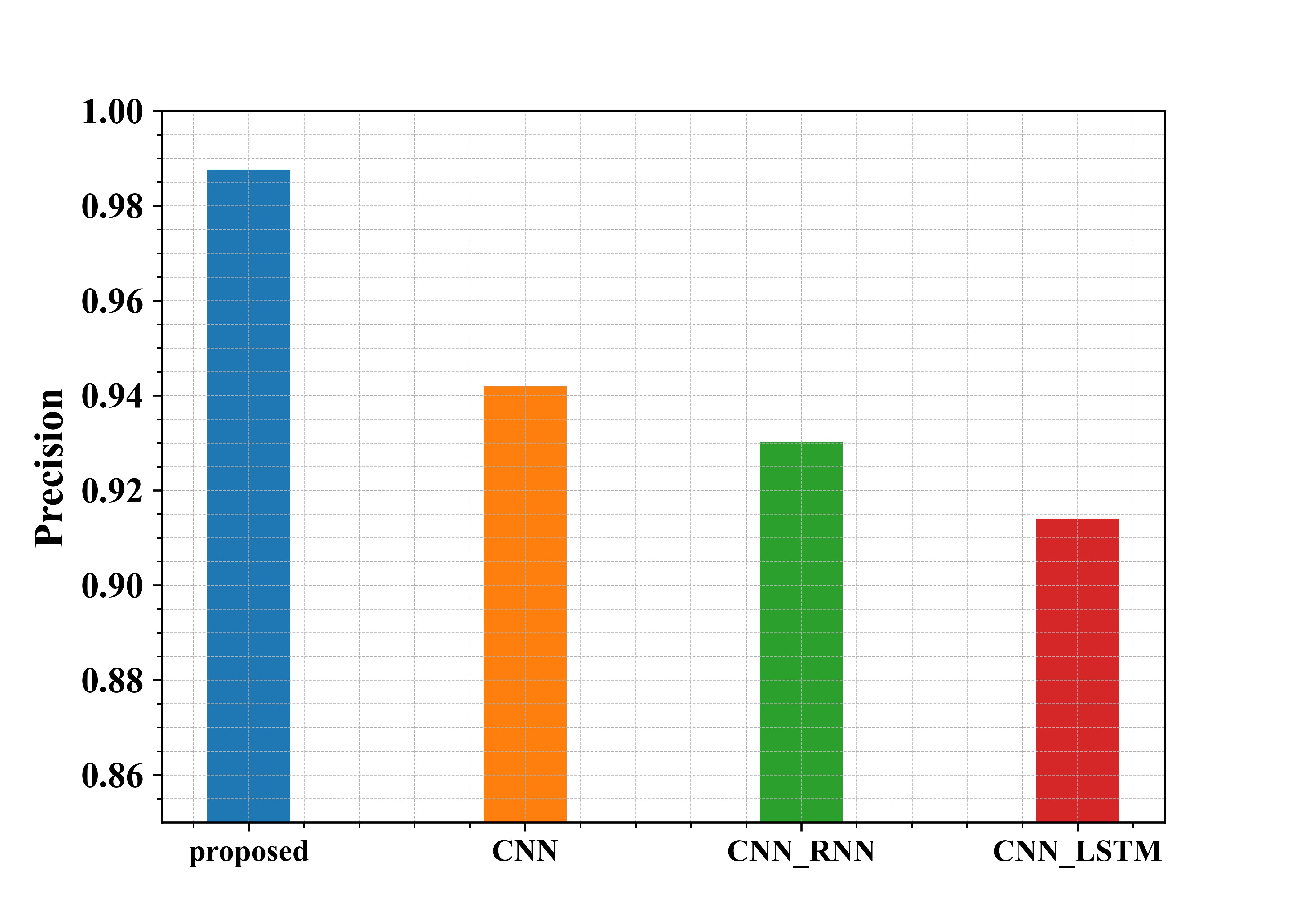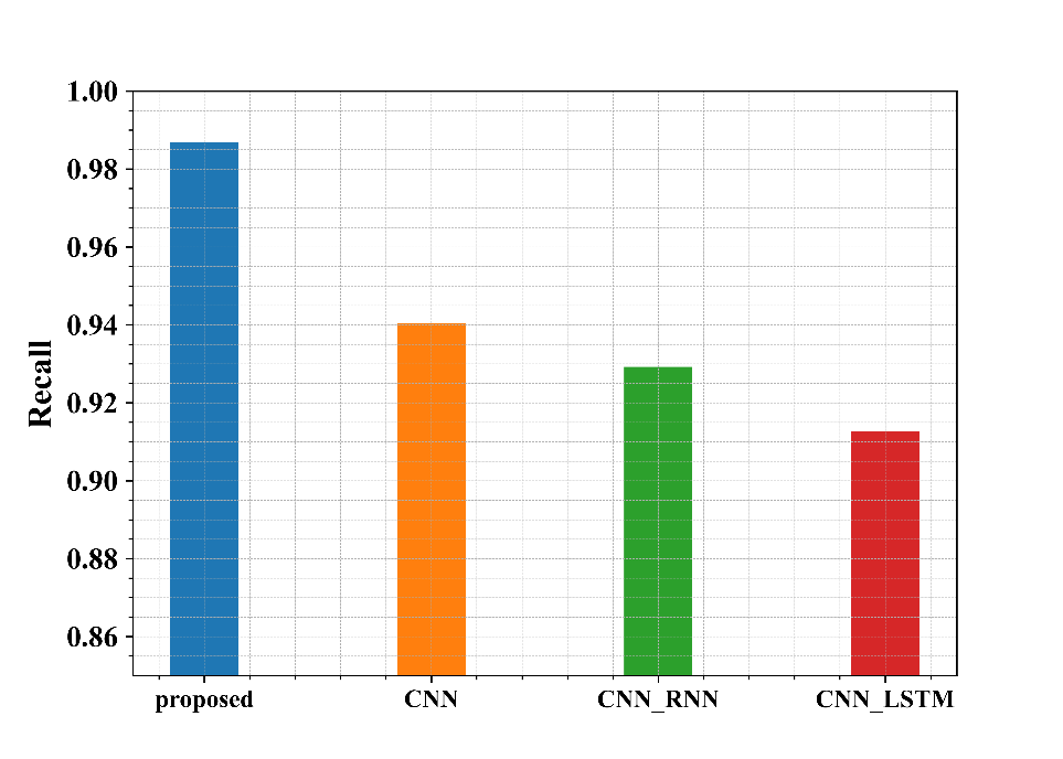 Figure 6 shows the examination of the recommended methods in use in regard to Precision. From the graph, the proposed approach has a Precision of about 98.7%, whereas the existing methods CNN, CNN-RNN and CNN-LSTM have a Precision of 94.1%, 93%, and 91.4%, respectively. Thus, from the graphical representation, it is seen that the proposed approach has a higher Precision.