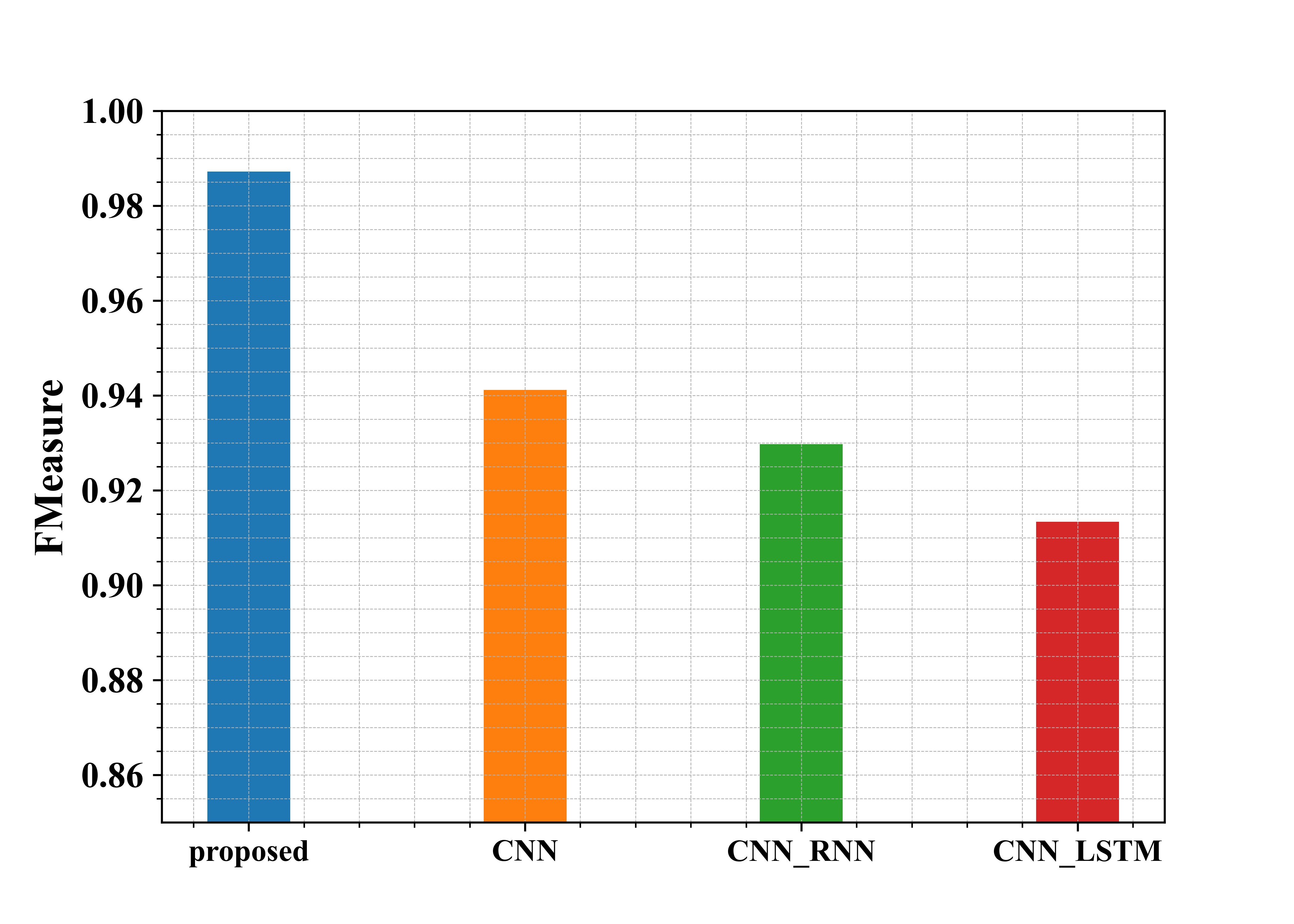 Figure 7 shows the examination of the recommended methods in use in regard to F-measure. From the graph, the proposed approach has an F-measure of about 98.7%, whereas the existing methods CNN, CNN-RNN and CNN-LSTM have an F-measure of 94%, 92.9%, and 91.3%, respectively. Thus, from the graphical representation, it is seen that the proposed approach has a higher F-measure.