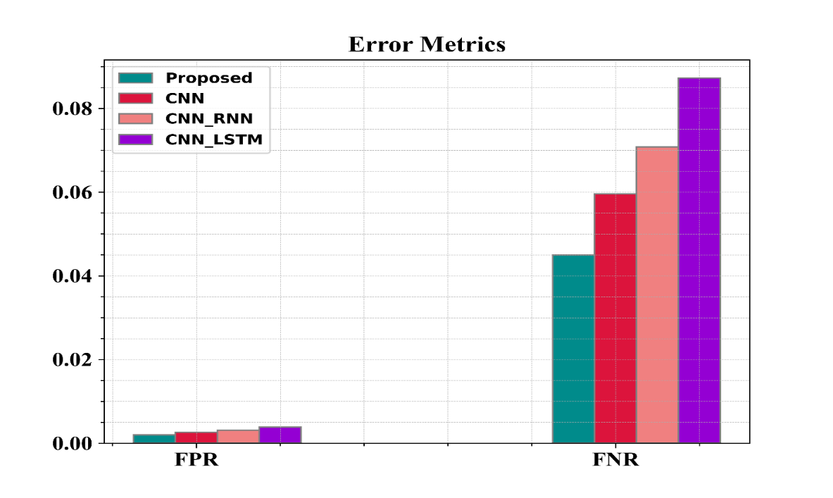 Figure 8 shows the examination of the recommended methods in regard to FPR and FNR. From the graph, the proposed approach has a lower FPR of 0.002%and lower FNR of 0.045%, whereas the methods in use have higher values