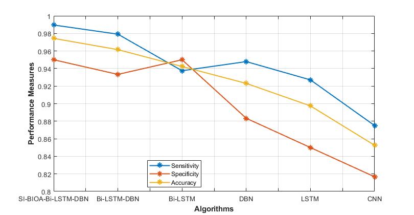Figure 4 illustrates the graphical representation of the performance metrics, such as sensitivity, specificity, and accuracy, for the proposed and existing techniques. The SI-BIOA-Bi-LSTM-DBN model has high accuracy, sensitivity and specificity as compared to the existing techniques.