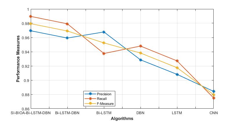 The present and suggested approaches can both be used; figure 5 shows the graphical depiction of performance parameters, including precision, recall and F- Measure. In comparison to previous methods, the SI-BIOA-Bi-LSTM-DBN model has good precision, recall and F- Measure.