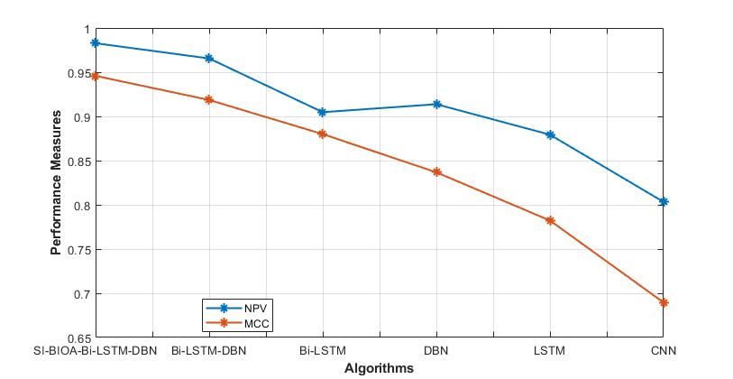 The graphical depiction of performance parameters, including NPV and MCC for the suggested and current approaches, is shown in Figure 6. When compared to the currently used approaches, the SI-BIOA-Bi-LSTM-DBN model has higher NPV and MCC.
