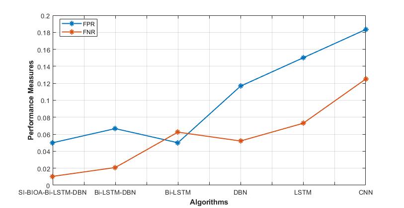 The FPR and FNR performance indicators for both proposed and current approaches are represented graphically in Figure 7. Comparing the SI-BIOA-Bi-LSTM-DBN model to the currently used methods reveals that it has lower FPR and FNR.