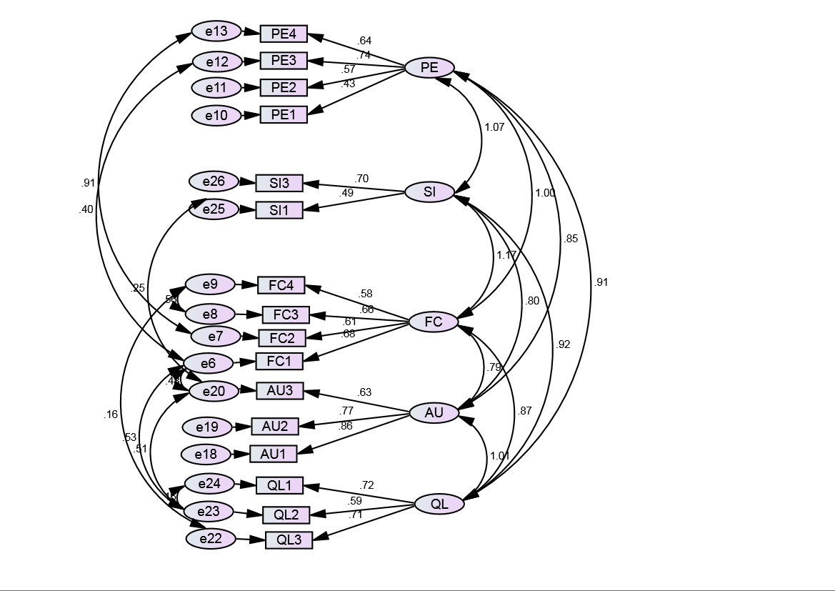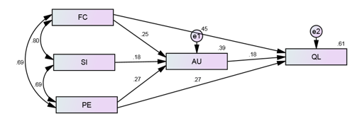 Based on the CFA model shows in above figure1, it is possible to conclude that Performance Expectancy, Social Influence, Facilitating Conditions, Actual Usage and Quality of Learning are statistically significant, which means that the Performance Expectancy have a significant influence in the Social Influence, Facilitating Conditions, Actual Usage and Quality of Learning. Social Influence has a significant influence in the Performance Expectancy, Facilitating Conditions, Actual Usage and Quality of Learning. Actual Usage has a significant influence in the Performance Expectancy, Social Influence, Facilitating Conditions and Quality of Learning. Quality of Learning have a significant influence in Performance Expectancy, Social Influence, Facilitating Conditions and Actual Usage. Factor loading values of all indicators in the measurement model is above 0.43 which is to the acceptable range of above 0.4.