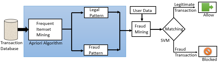 The matching algorithm and frequent item set mining are the two key components of the suggested system. To do this, legitimate and fraud transaction group is created via frequent itemset mining, while transaction has been classified as either legitimate or fraud based on the matching algorithm that matches user’s transaction history. The system uses Apriori algorithm for the frequent itemset mining and SVM method for matching. The suggested system’s process is depicted in Figure 2.