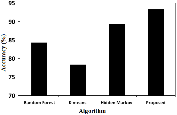 The suggested approach outperforms K-means, random forest (RF), and hidden Markov model in terms of accuracy, as demonstrated by Chart 1. But when it comes to credit card truncation, accuracy is just as crucial as the algorithm’s false positive rate. The credit card users or administrator will become irritated if there are several false triggers for fraud transactions, which could lead to ignorance about fraud changes. The test results of various ML algorithms are put to comparison with the suggested approach in order to ascertain the ratio of false transactions. Through taking into account the total number of fraud transactions that have been discovered and the number of false fraud transactions, Chart 2 compares the suggested algorithm with RF, hidden Markov model, and K-means.