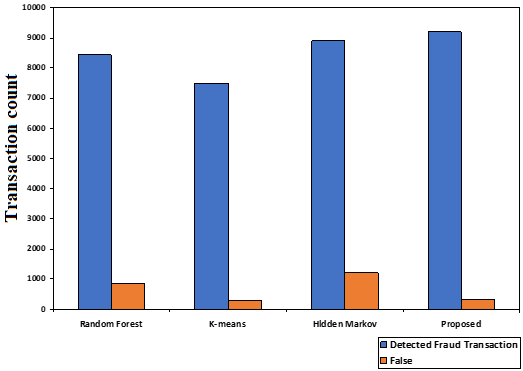 Chart 2 demonstrates that while fraud detection in Hidden Markov model and RF is higher, it frequently results in false fraud transactions, which could negatively impact user experience and system performance. In contrast, K-means algorithm is observed to have a lower false fraud detection rate, yet it fails to identify true fraud transactions, which will decrease system accuracy. However, it is noted that the suggested method has a high accuracy in detecting fraud transactions and generates fewer false triggers for fraud transactions.
